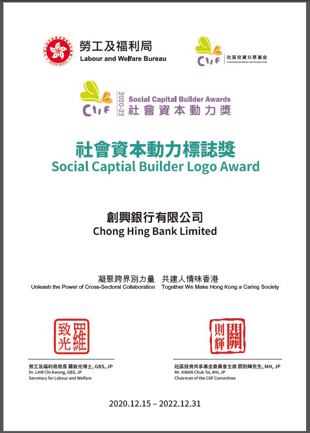 ,让各界共同见证及分享香港建立社会资本的成果。今年,除创兴银行外,汇丰银行、星展银行及东亚银行等知名银行亦获颁发“社会资本动力标志奖”。